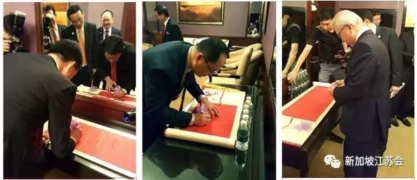 新加坡总理公署部长兼职总秘书长陈振声先生、中国驻新加坡大使馆临时代办房新文先生和新加坡宗乡会馆联合总会会长蔡天宝先生在贵宾薄上签到留言