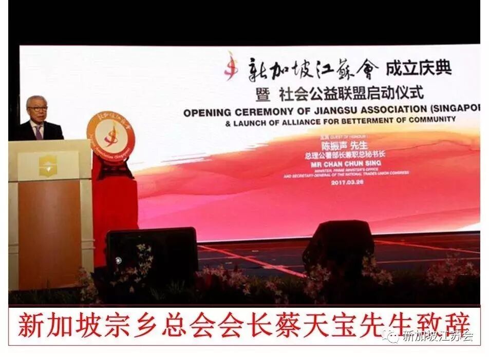 新加坡宗乡会馆联合总会会长蔡天宝也在致辞中对新加坡江苏会的成立表示热烈祝贺,并指出像江苏会这样的新移民团体,要做的不仅是积极拓展联系网,同时还要与友族同胞互动,加强沟通和信任。他也鼓励江苏会与其他团体合作,实现资源共享,再结合众人的力量回馈社会。这样不但能使会务多元化,还能帮助会员更有效地融入本地,从中提升归属感。