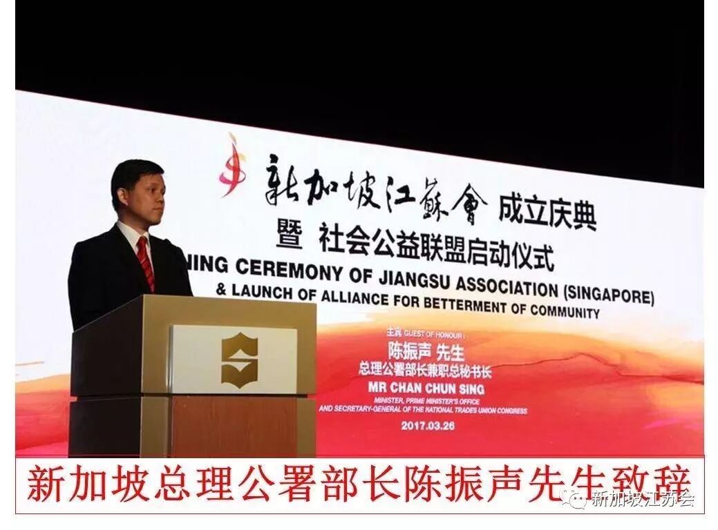 在庆典上,新加坡江苏会会长周兆呈博士、中国驻新加坡大使馆临时代办房新文先生和新加坡宗乡会馆联合总会会长蔡天宝先生先后致辞。最后新加坡总理公署部长兼职总秘书长陈振声先生作了重要讲话。陈振声部长说,新加坡与中国江苏省有着深厚的渊源和经贸往来,也在多个领域开展广泛合作,相信新加坡江苏会的成立将会进一步推动新加坡和江苏乃至中国在经贸、科技、文化和教育等领域的交流与合作。部长也指出今天的宗乡会馆不应只是和祖籍地建立联系,还要以新加坡为平台,面向世界,衔接世界网络。