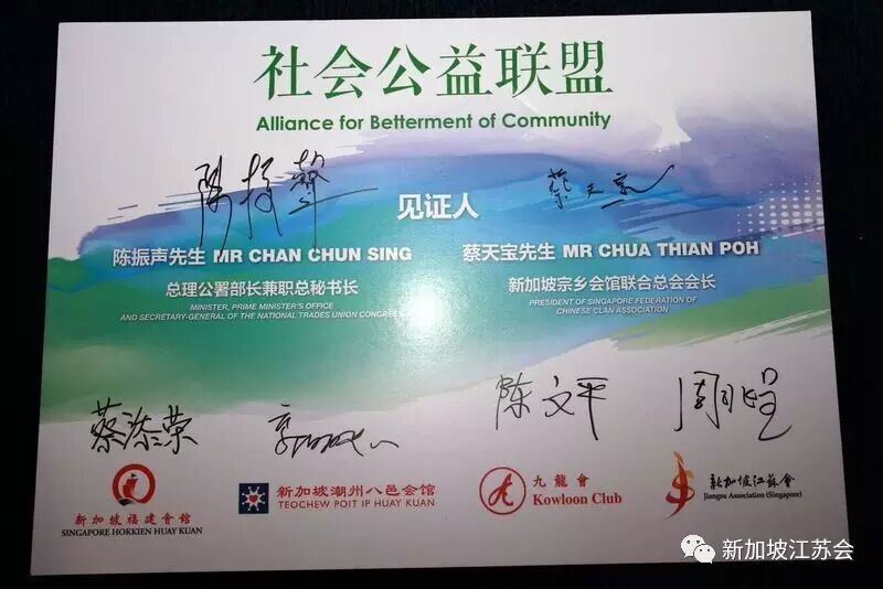 在3月26日的晚宴上,另一个重点是“社会公益联盟”的启动仪式。新加坡江苏会成立后就积极开展公益慈善活动。2017年3月4日,江苏会理事会和会员义工团组织了一项大型的慈善活动,到裕廊同敬怀仁院做义工,组织文艺和游戏活动,并捐钱捐物。正如周兆呈会长在致辞中说的那样,江苏会很愿意扮演组织者或协调者的角色,为有意愿当义工的会员提供机会和渠道,推动更多人回馈社会。