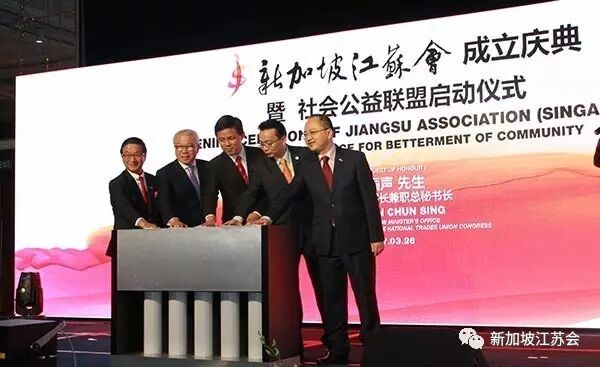 在庆典上,在热烈的掌声中,新加坡总理公署部长兼职总秘书长陈振声先生、中国驻新加坡大使馆临时代办房新文先生、新加坡宗乡会馆联合总会会长蔡天宝先生、新加坡中华总商会会长黄山忠先生和新加坡江苏会会长周兆呈博士共同按启江苏会会徽视频,为江苏会的正式成立开启了新的篇章。