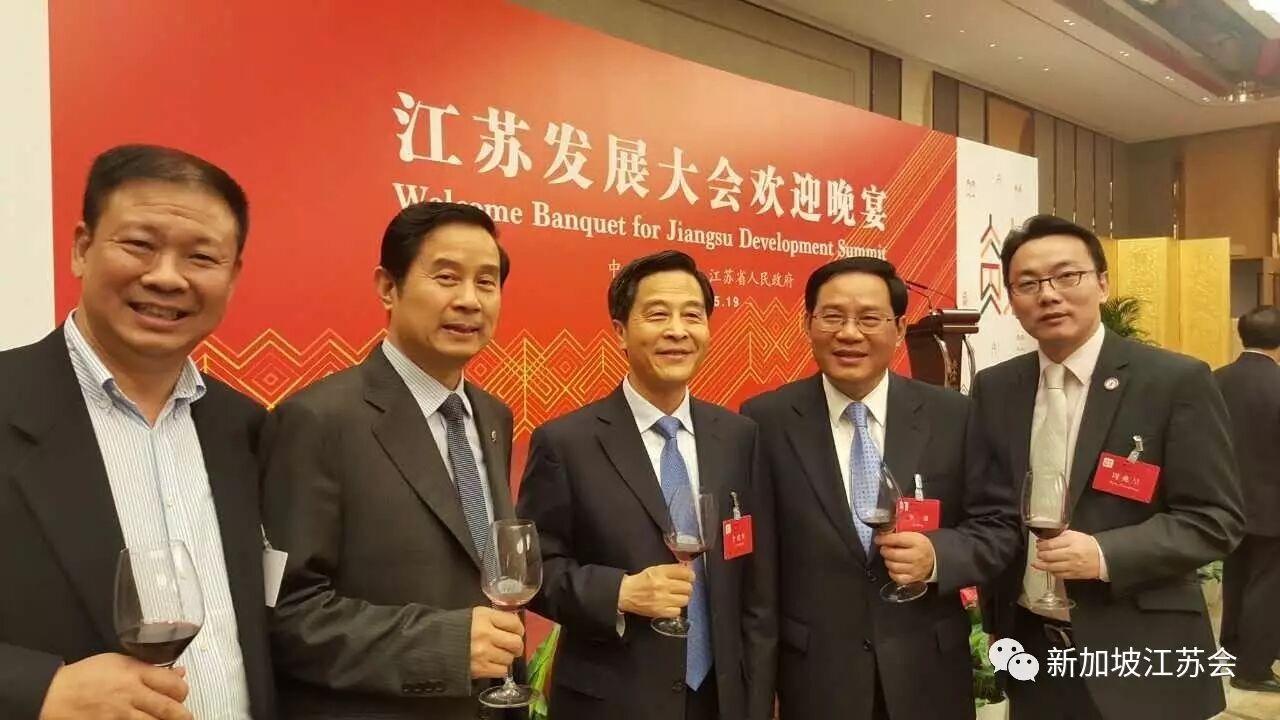 江苏省委书记李强(右二)、招商集团董事长李建红(中)、江苏省人大常委会副主任史和平(左二),与周兆呈会长、北京江苏企业商会会长暨新加坡江苏会名誉会长范玉荣(左一)